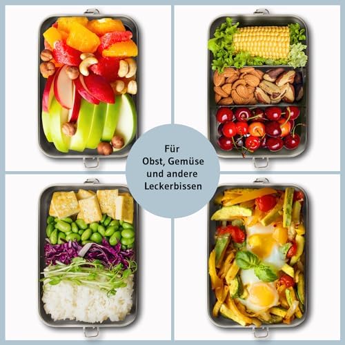 Die hochglanzpolierte Innenseite und die matte, gebürstete Außenseite der Lunchbox erleichtern die Reinigung und bieten eine hohe Widerstandsfähigkeit gegen Kratzer und Abnutzung. Dies macht die Dimono Lunchbox ideal für den täglichen Gebrauch, ohne dabei an Ästhetik zu verlieren.